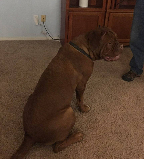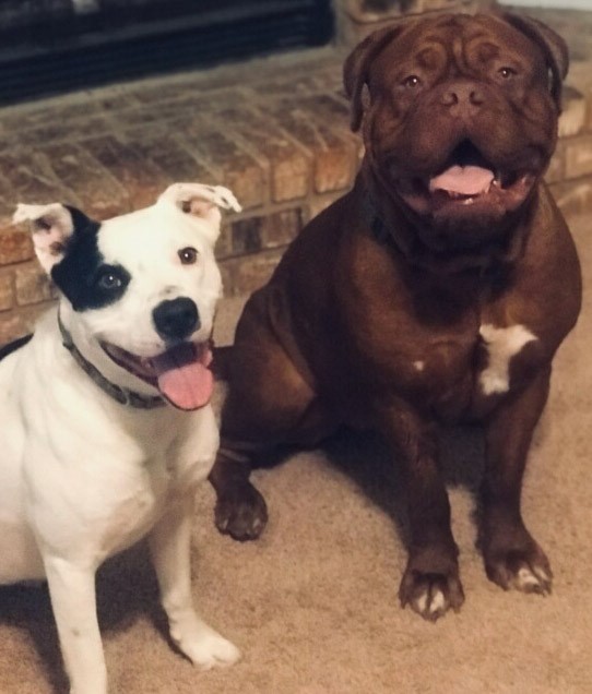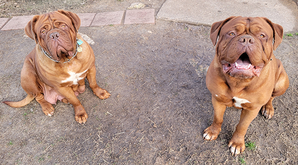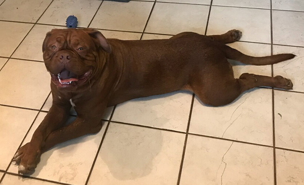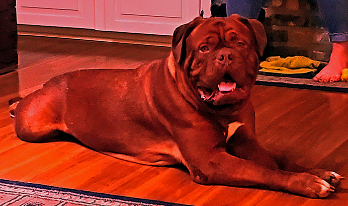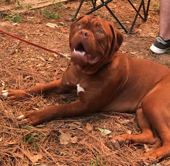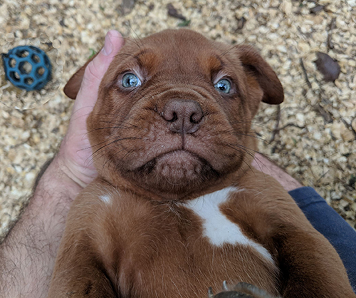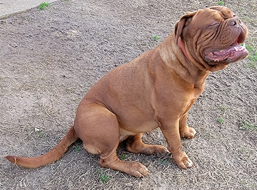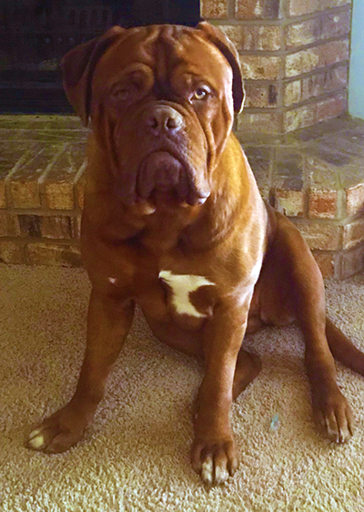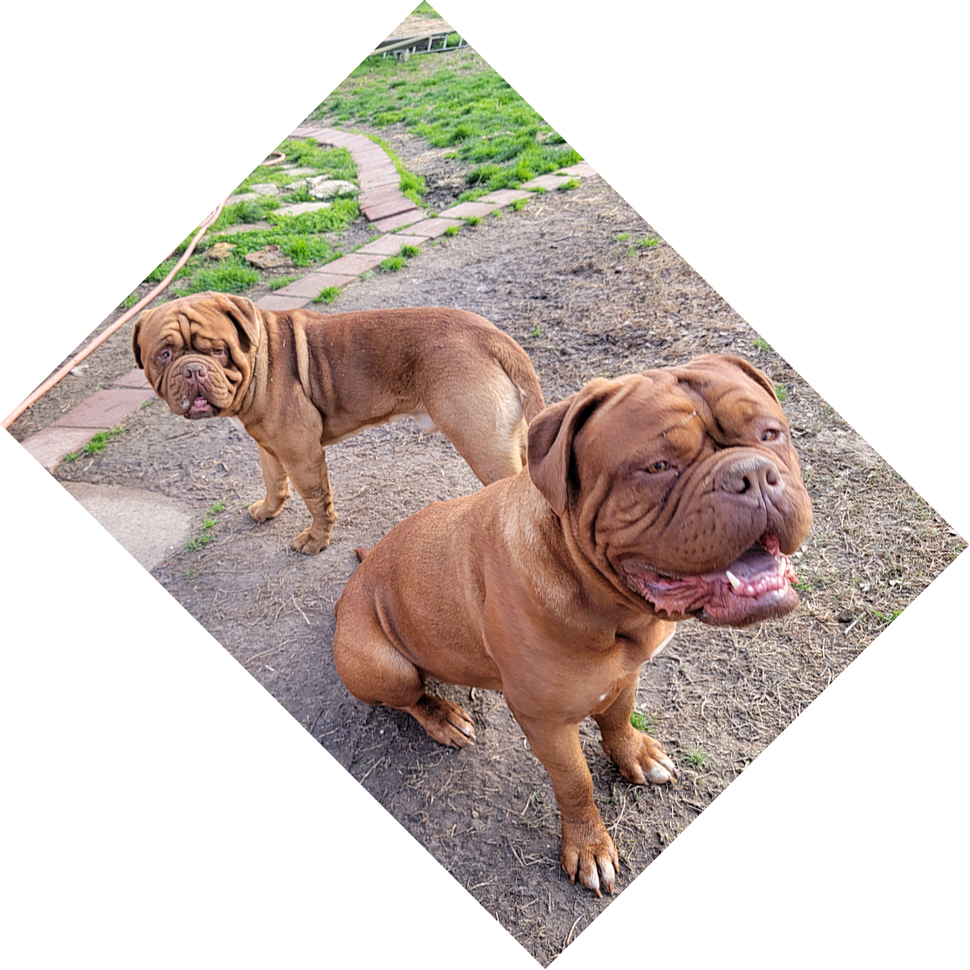 Ruby is the start of the 4th generation of Dogue's at Ivy Bordeaux. A 1st pick female pup I kept to better the breed. Her lines go back to my first two beautiful Bordeaux's, Champion Bane (son of the infamous Park Ave Razz) and Bailey. She is a HUGE, has a massive head, and is a deep-mahogany block of love. Ruby lives with the Wiggins near Lindale, TX. Her sire was my gentlest of all giants, Dyson.