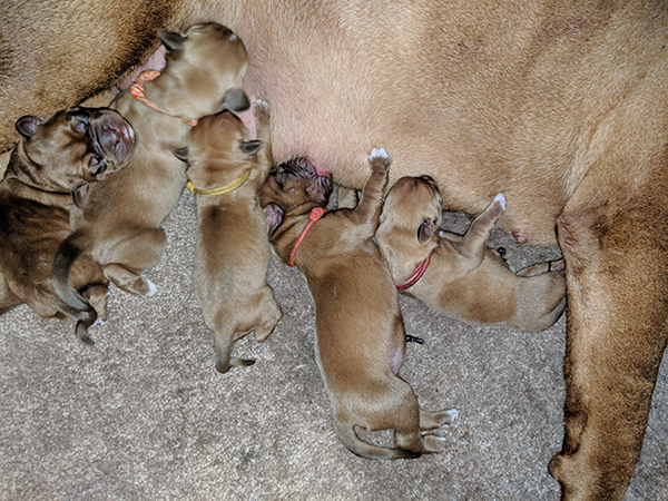 Here is Ruby's newborn baby pics, 4/1/2018. She was born here at Ivy Bordeaux to Dyson and Rogue. She's the big one in the pink collar.