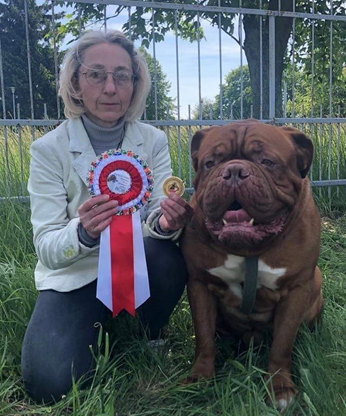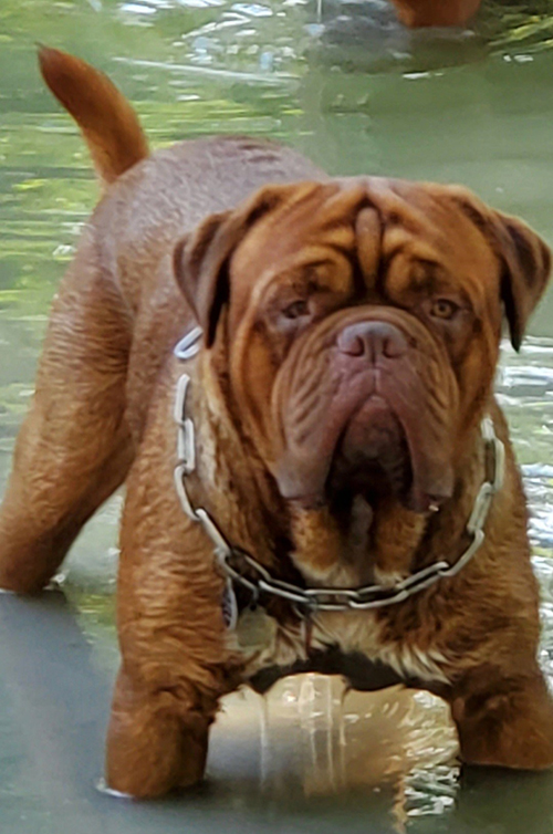 "Yak" is our newest import from the Gazeno Kennel in Poland. He comes from a superb, long bloodline of show-winning dogues. His father, "Jurand", is the first Polish Grand Champion. His mother, "Misty Knight", has won several BOB. "Yak" came off the 12 hour plane ride tail a-wagging, bright eyed, and ready to go! He is very outgoing and loving.. He's got a perfect coat, excellent head and confirmation, and incredible hips.